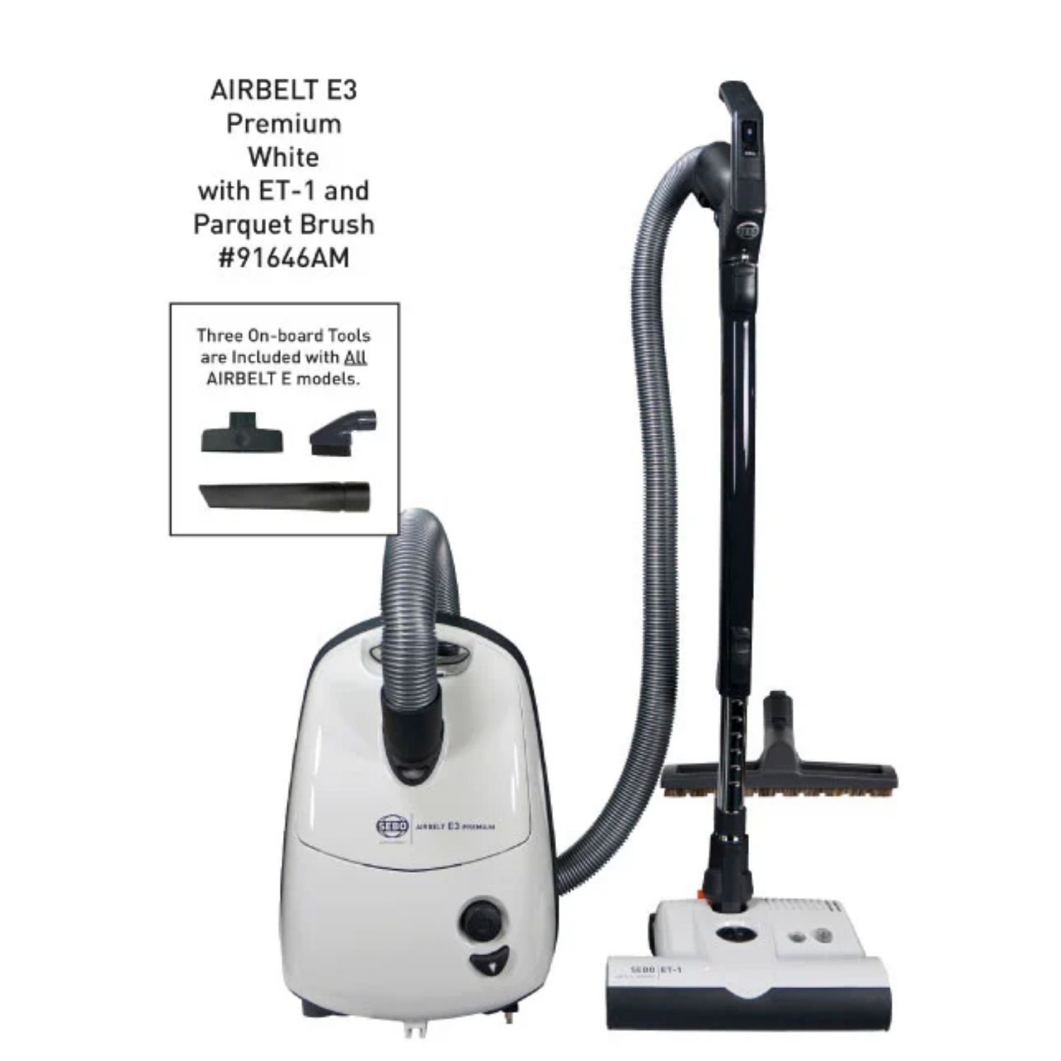 The AIRBELT E3 Premium offers much more! In addition to a parquet brush, it includes the commercial-quality ET-1 electric power head that cleans both carpets and hard floors, has excellent pet hair removal, and the extension side of its L-shaped contour makes cleaning under counters easy. The power head also offers a super-low 3.5-inch horizontal cleaning profile, tool-free brush roller removal, and automatic shut off due to brush roller obstructions, while its tapered suction hose increases airflow velocity and decreases clogs. Foremost among its many features, the E3’s dual-control handle provides unsurpassed user convenience with an integrated on/off switch for the brush roller, a slider switch that adjusts suction power, and it facilitates effortless control of the power head’s 180⁰ steering ability.
